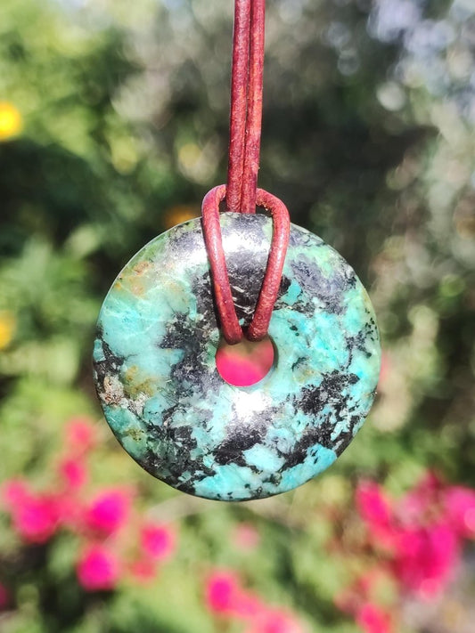 40mm Cuprit-Chrysocoll - Donut Edelstein Kette - Inkl. 2mm Lederband in dunklem Antik Braun zum Knoten.Der Chrysokoll ist ein Mineralstein, dessen Farbe von grün bis türkis variiert. Er bildet Mineralaggregate,...