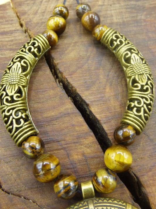 Wunderschöne Kette mit einem Bronze Blumen Mandala Anhänger - verziert mit natürlichen Tigerauge Edelsteinen Als Band gibt es hier eine 1mm sehr stabile Baumwollwachsschnur. Wir wünschen viel Freude beim rumstöbern...