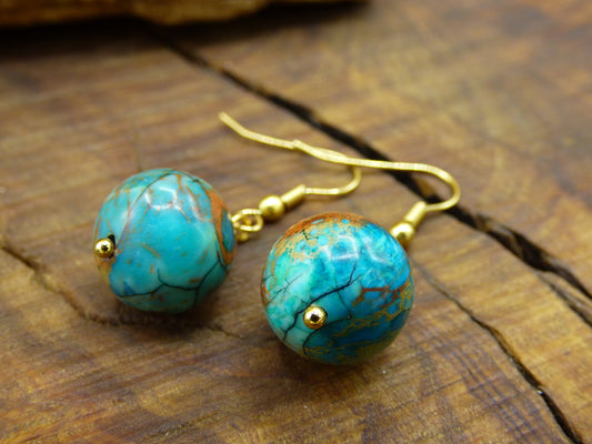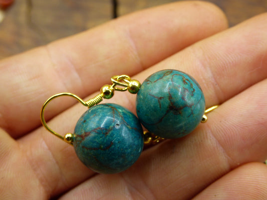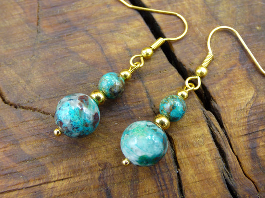 Hier eine ganz neue Kreation von uns ~Chrysocoll~ Edelstein Ohrringe mit goldenen Zwischenperlen. (Gerne kann alles zu Silbernem Material umgewandelt werden - siehe Kaufoption) Hier sind 3 verschiedene Unikate abgebildet...