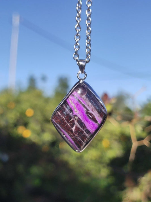 Edelstein Kette mit einem echtem ~Sugilith mit noch seltenerem roten Bustamit~ in einer 925 Silberfassung + Öse & einer 304 Edelstahl Kette mit Karabinerverschluss Größe Anhänger: siehe € Stück Vergleichsfoto...