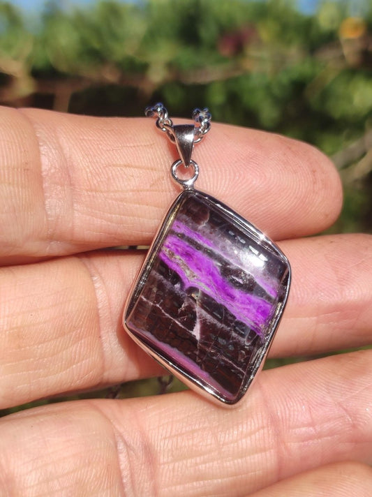 Edelstein Kette mit einem echtem ~Sugilith Bustamit~ in einer 925 Silberfassung + Öse & einer 304 Edelstahl Kette mit Karabinerverschluss Größe Anhänger: siehe € Stück Vergleichsfoto Ein wundervoller Edelstein mit...