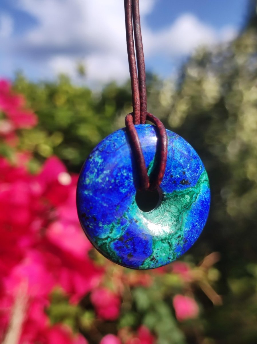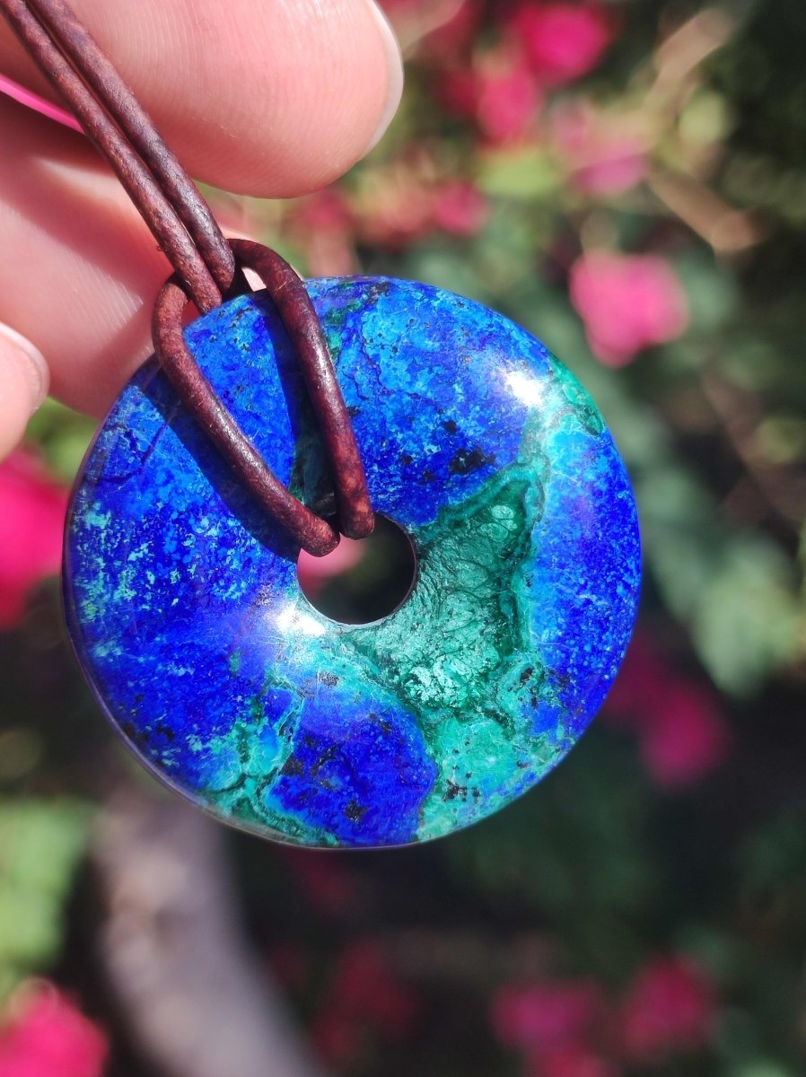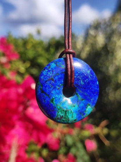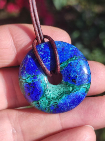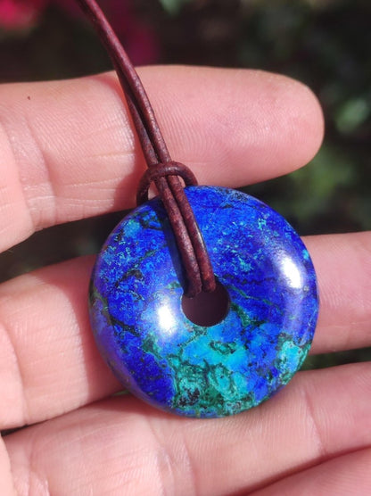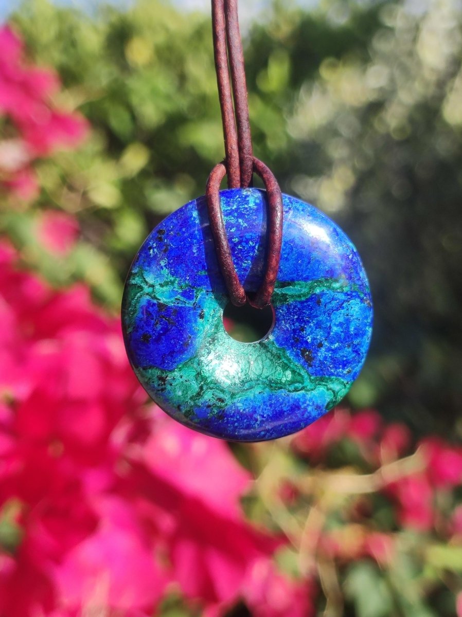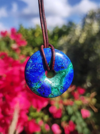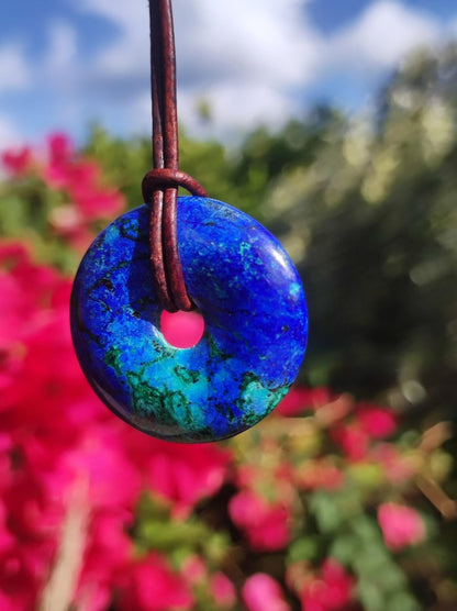 Azurite - Malachite - Chrysocoll gemstone necklace ~ donut shape ~ including leather cord 1.5mm in antique brown for knotting.