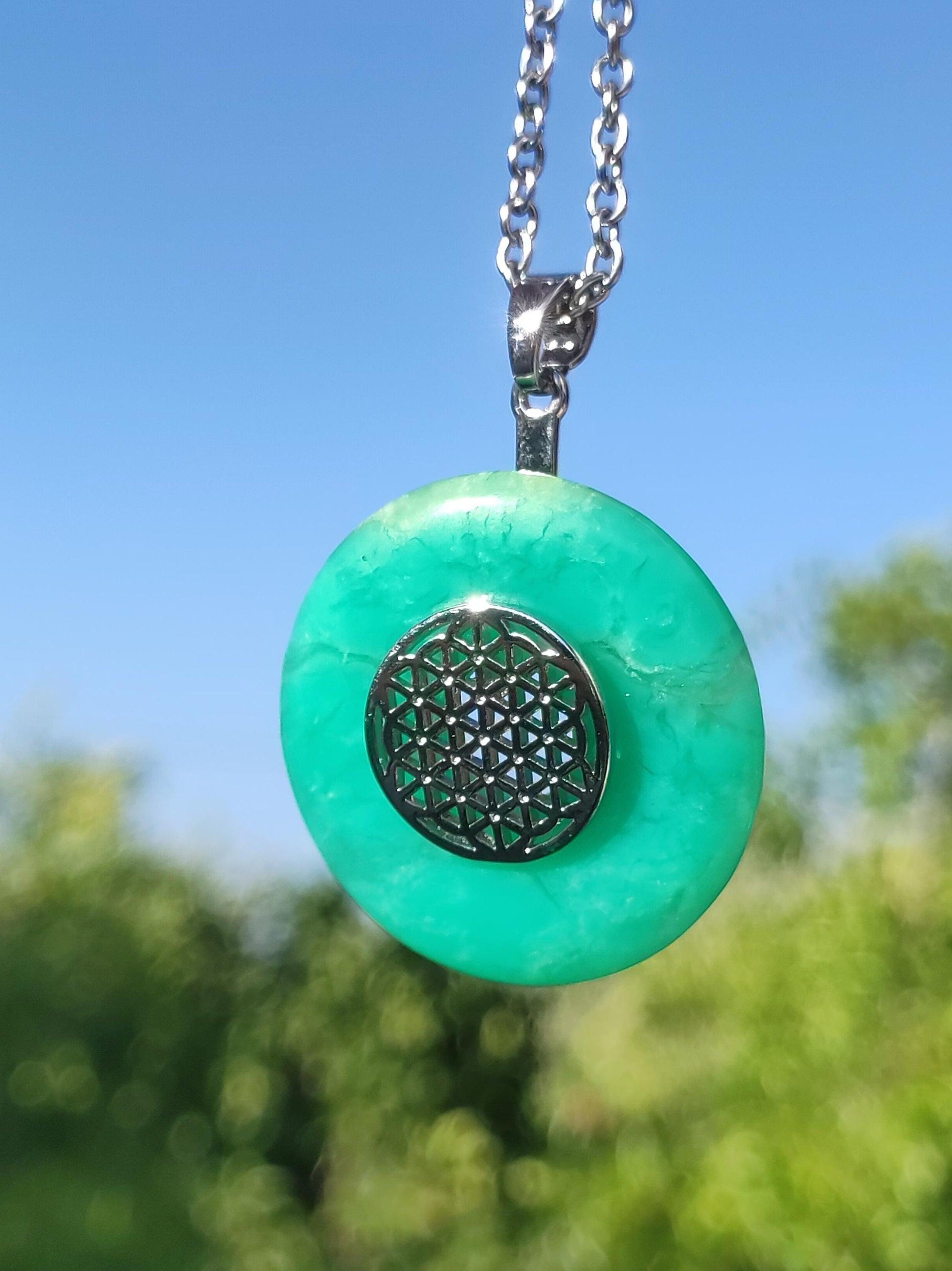 30mm Chrysoprase AAA protective donut from Australia ~ incl. "Flower of Life" donut holder made of 304 stainless steel (silver alloy) + 304 stainless steel chain with lobster clasp