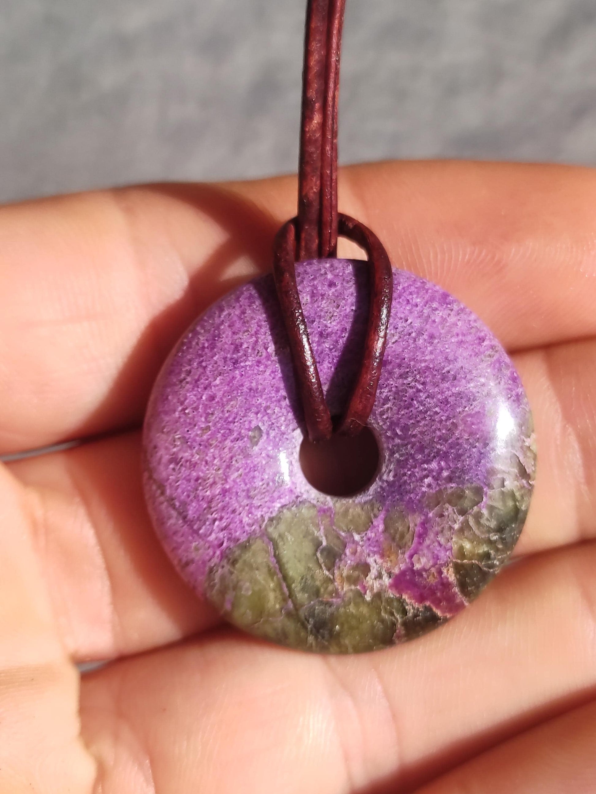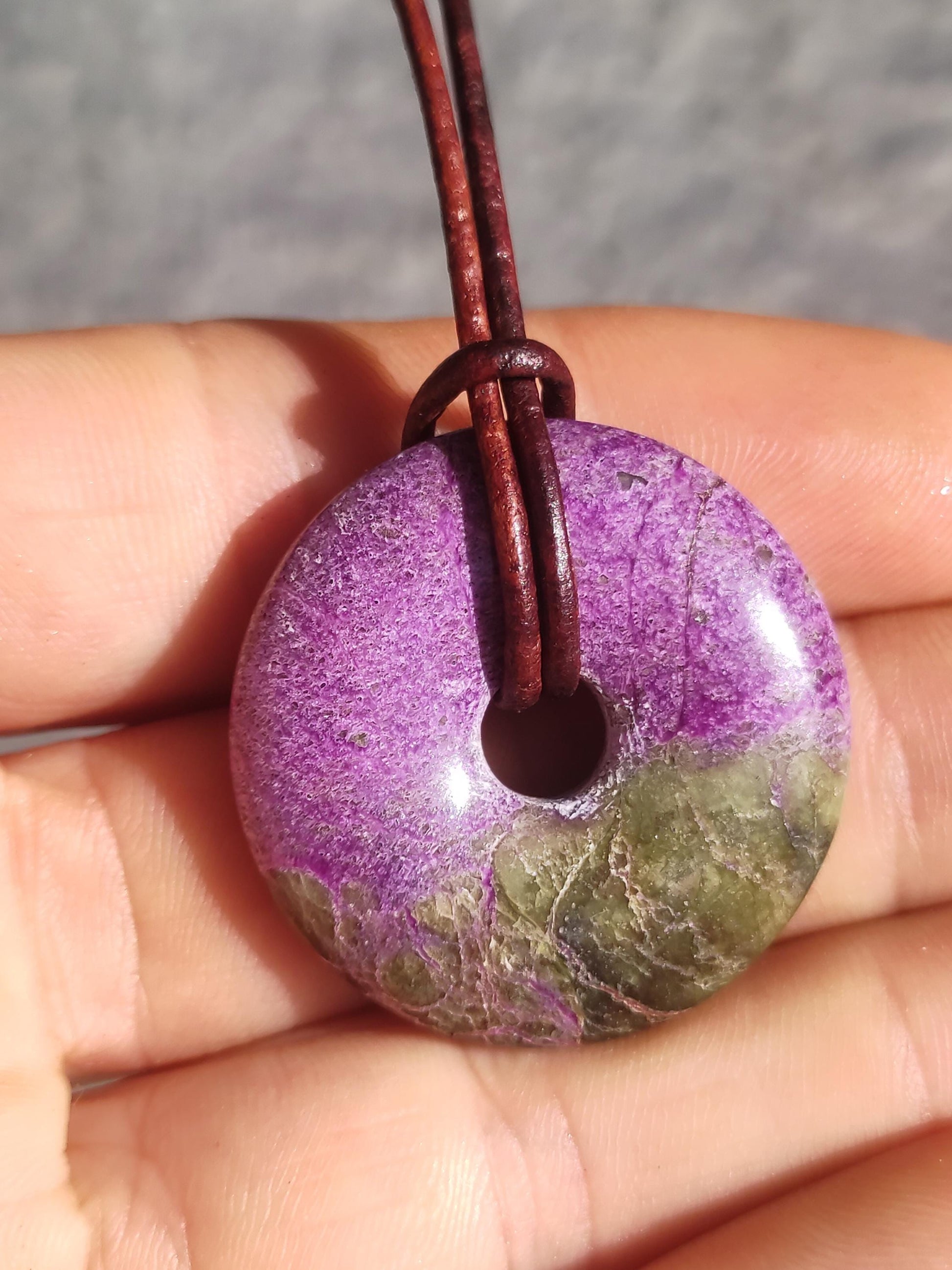 Gemstone necklace ~ Stichtite 30mm donut ~ including 1.5mm antique brown leather cord for knotting. The green part is serpentine You will receive the Stichtit Donut shown A wonderful quality...