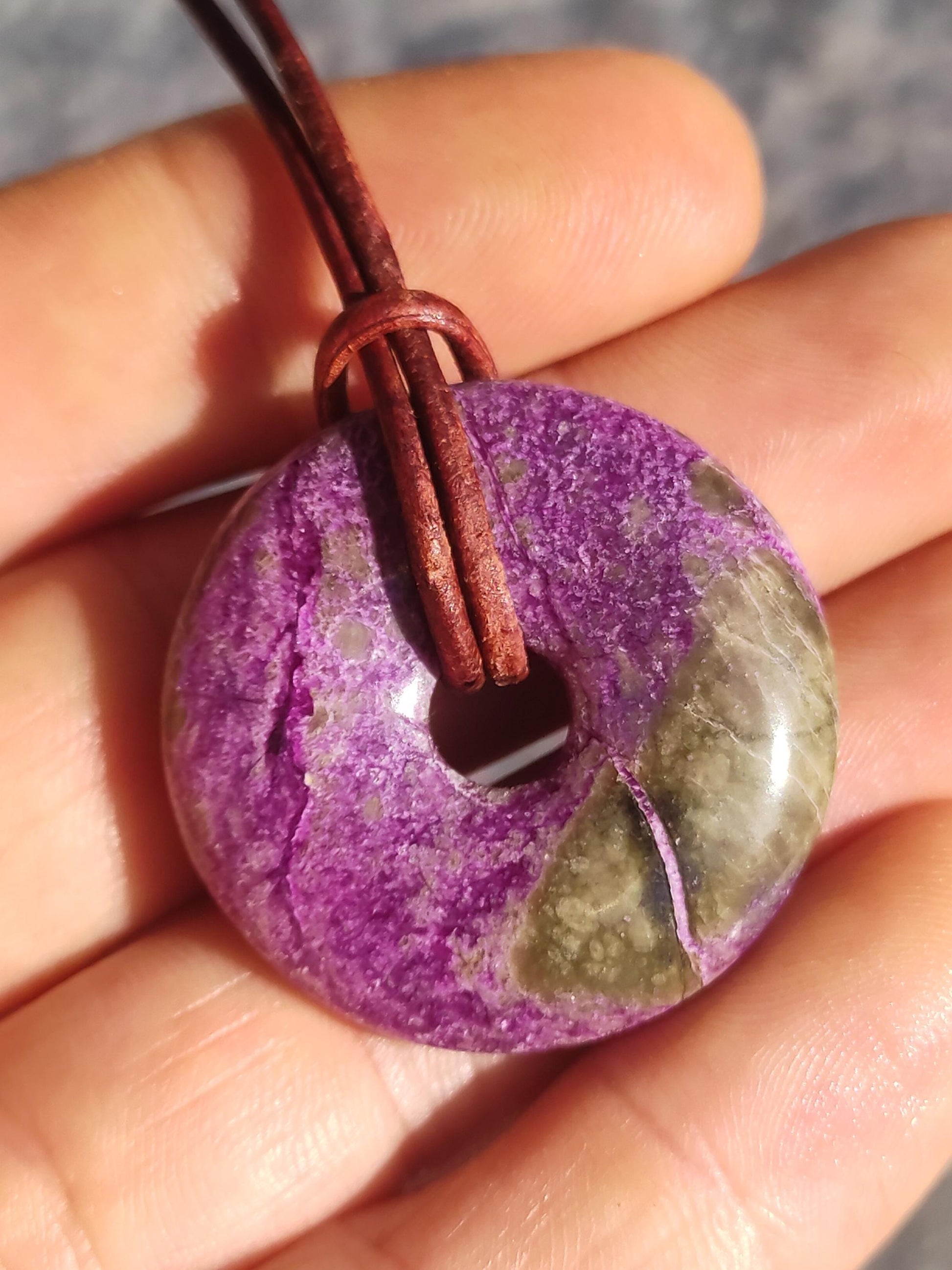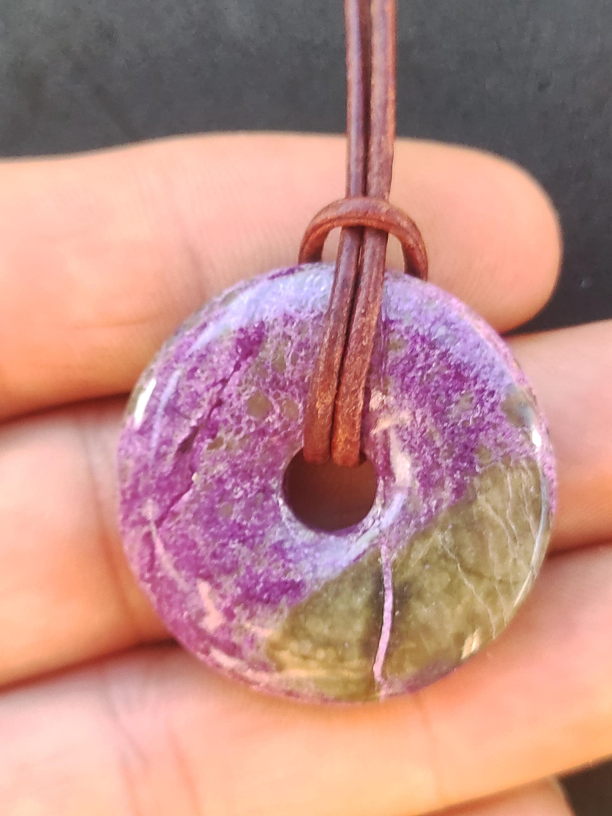 Stichtite + Serpentine ~ Gemstone Donut Necklace Pi Disc Protection Symbol Purple Violet HIPPIE Chakra Boho Ethno Healing Stone Festival Purple Rarity