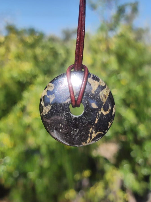 Pyrite Donut 30mm gemstone necklace ~ including leather cord 1.5mm in antique brown for knotting for desired length. You will receive the stone pictured - a very special unique piece...