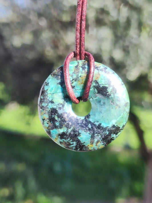 30mm cuprite chrysocolla - donut gemstone necklace - including 2mm leather cord in dark antique brown for knotting. Chrysocolla is a mineral stone whose color varies from green to turquoise....
