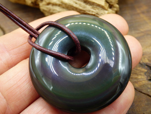 Gemstone necklace with a rainbow obsidian (obsidian = dragon glass in Game of Thrones) 30 or 40mm donut including 2mm leather cord in antique brown for knotting. A very special...