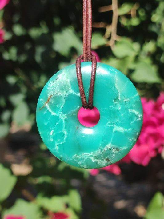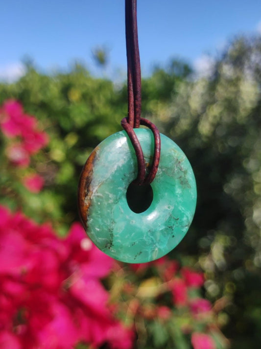 30mm Chrysoprase AAA protective donut from Australia ~ Extreme rarity & only available once You will receive the stone shown in the picture! Includes antique brown 2mm leather cord for...