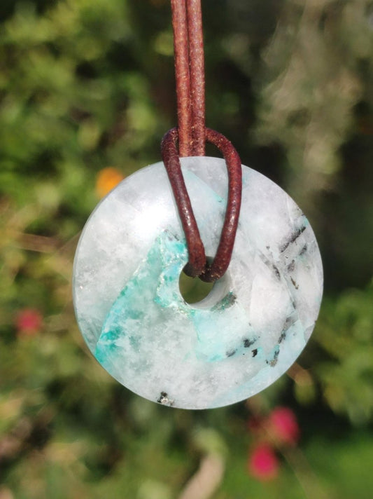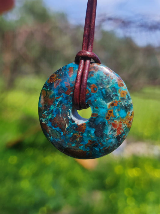 Quantum Quattro = Chrysocoll - Quartz - Dioptase - Shattuckite - Malachite) Quantum Quattro Donut 30mm gemstone necklace ~ including leather cord 1.5mm in antique brown for knotting for desired...