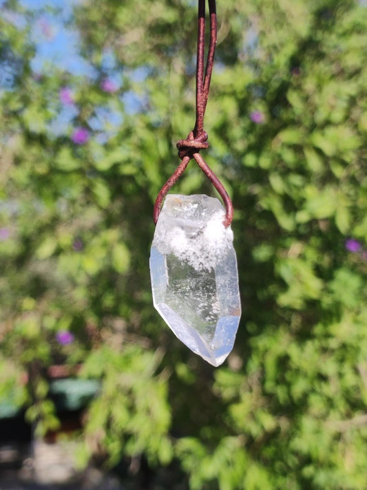 Rock crystal point A quality (very clear) - drilled ~ gemstone necklace - including 1.5mm antique brown leather cord A very rare rarity, very clear quartz point Origin: Brazil When...