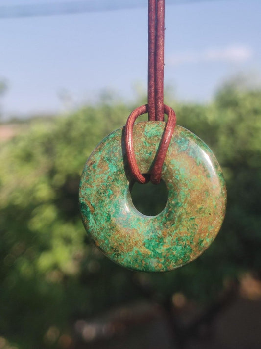 A beautiful 40mm Chrysocolla protective donut ~ a very special rarity Includes a 1.5mm antique brown leather cord for knotting. Origin: Peru Chrysocolla is a mineral stone whose color varies...