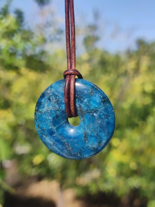 Gemstone necklace with an apatite gemstone donut ~ 30mm including 2mm antique brown leather cord for knotting. Very thick and intense blue :) apatite The name apatite comes from Greek...