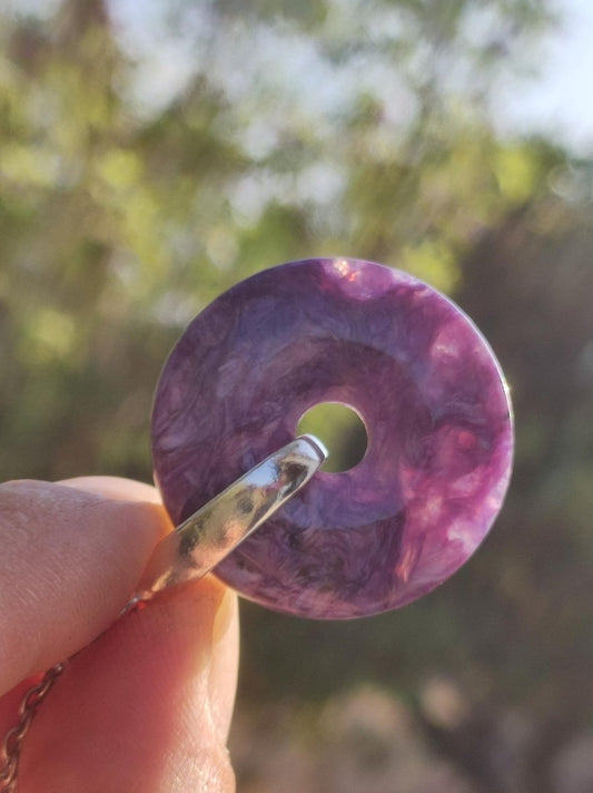 Gemstone donut necklace with a genuine ~Sugilite~ A very beautiful Sugilite donut, partly even transparent areas (gel Sugilite) Size: 31 x 6 mm Includes 1.5mm antique brown leather cord for...