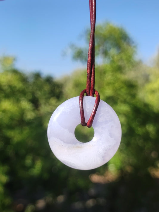 Gemstone necklace with a ~ Chalcedony A 30mm ~ donut shape with a 2mm antique brown leather cord for knotting. When you first start exploring the topic of crystals and...