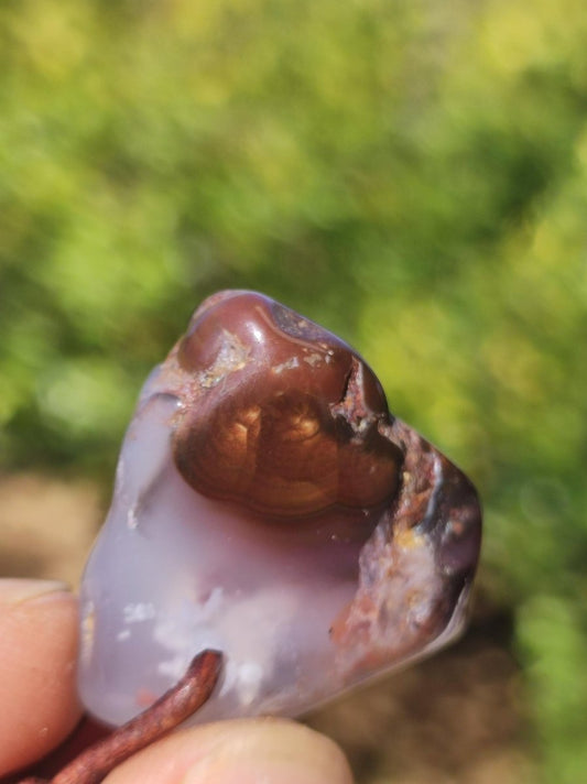 A very rare find ~ Purpurite Includes a 2mm antique brown leather strap for tying to your desired length. Gemstones and crystals produce diverse effects as healing stones, chakra stones,...