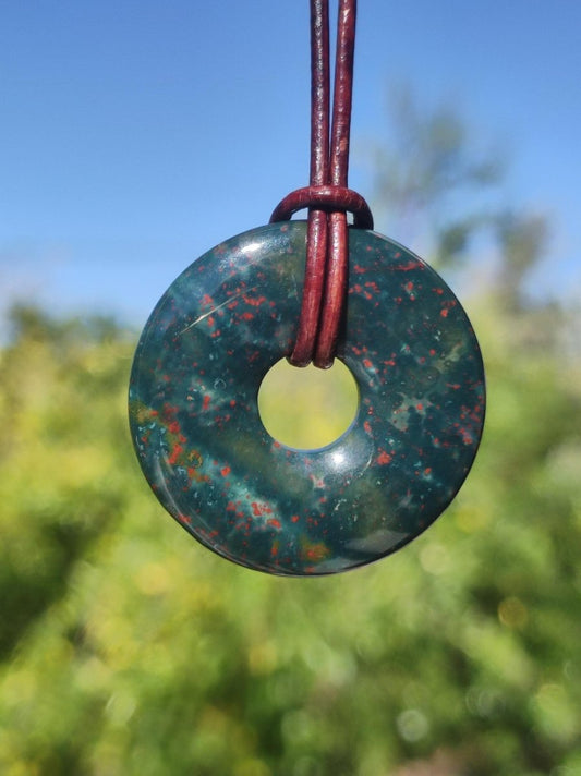 Heliotrope ~ Donut 30mm ~ Gemstone Necklace ~ incl. 2mm Antique Brown Leather Cord for Knotting heliotrope In Hildegard von Bingen's lithotherapy (crystal healing), heliotrope, also known as blood jasper,...