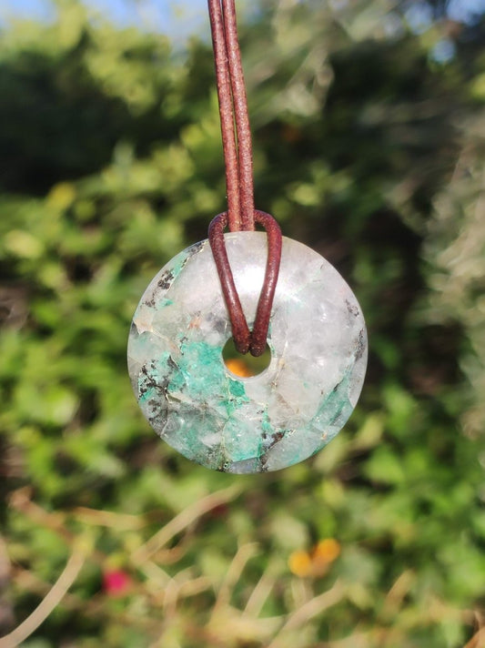 Quantum Quattro = Chrysocoll - Quartz - Dioptase - Shattuckite - Malachite Quantum Quattro Donut 35mm gemstone necklace ~ including 1.5mm antique brown leather cord for knotting to your desired...