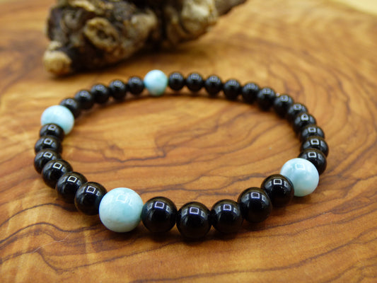 8mm Larimar & 6mm Black Tourmaline ~ Gemstone Beaded Bracelet Both AAA quality For optional: ~on a stretch cord ~or with clasp: 304 stainless steel carabiner ~High quality natural gemstones...