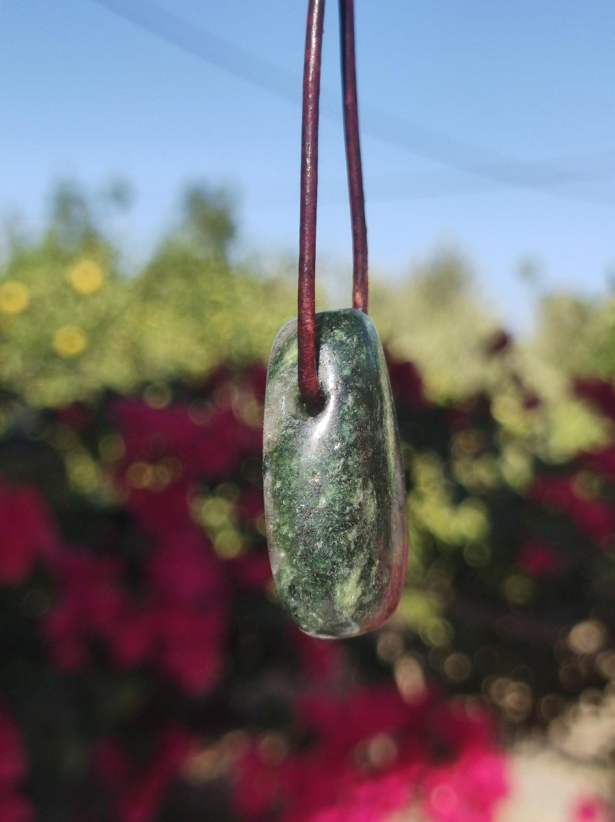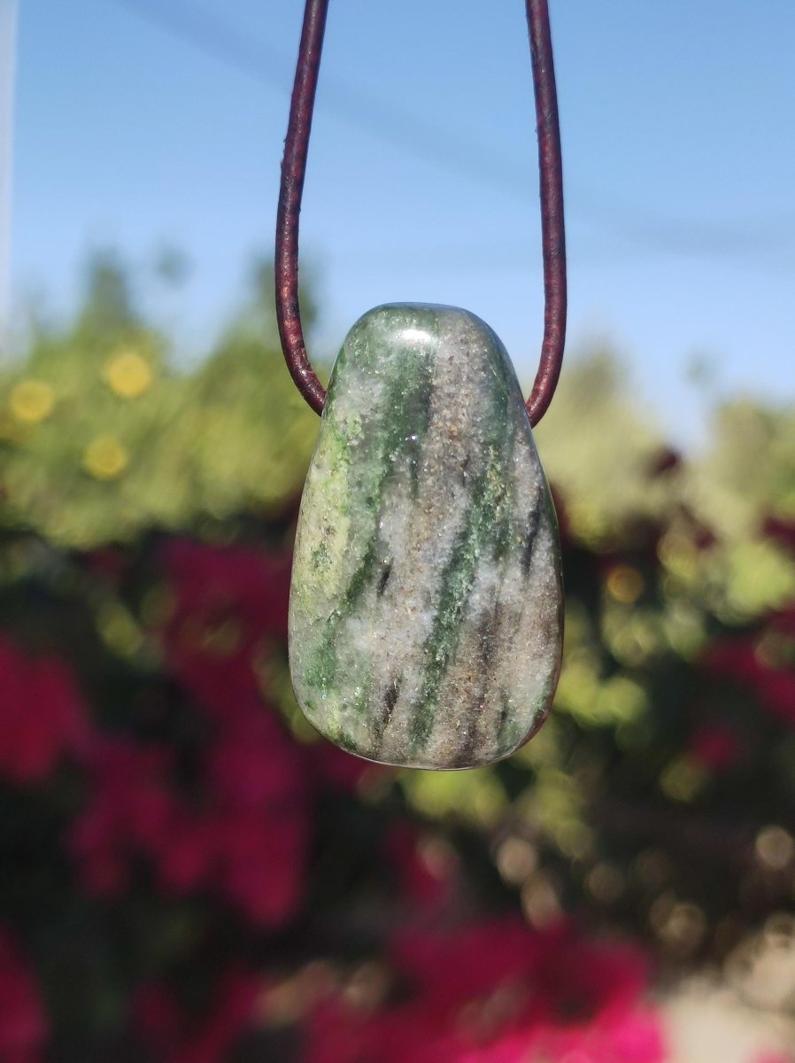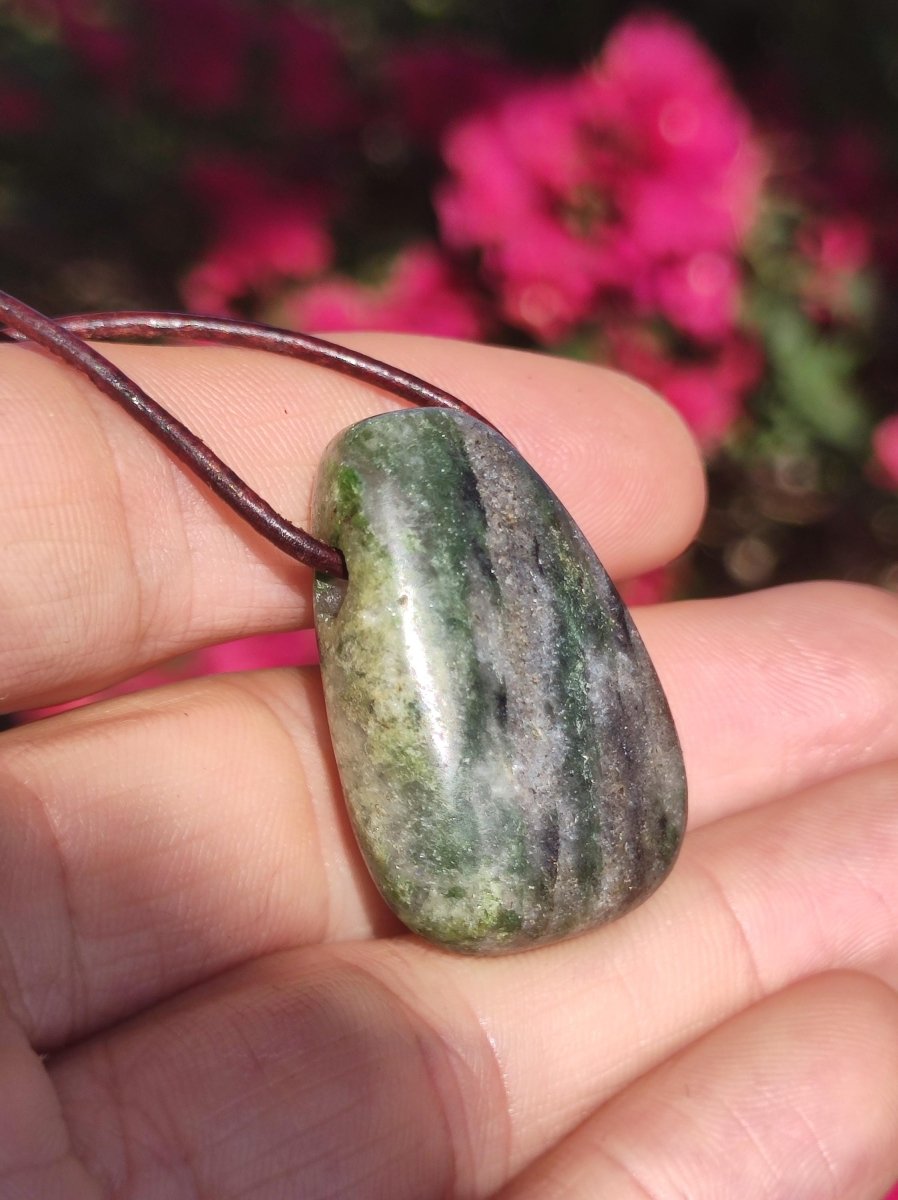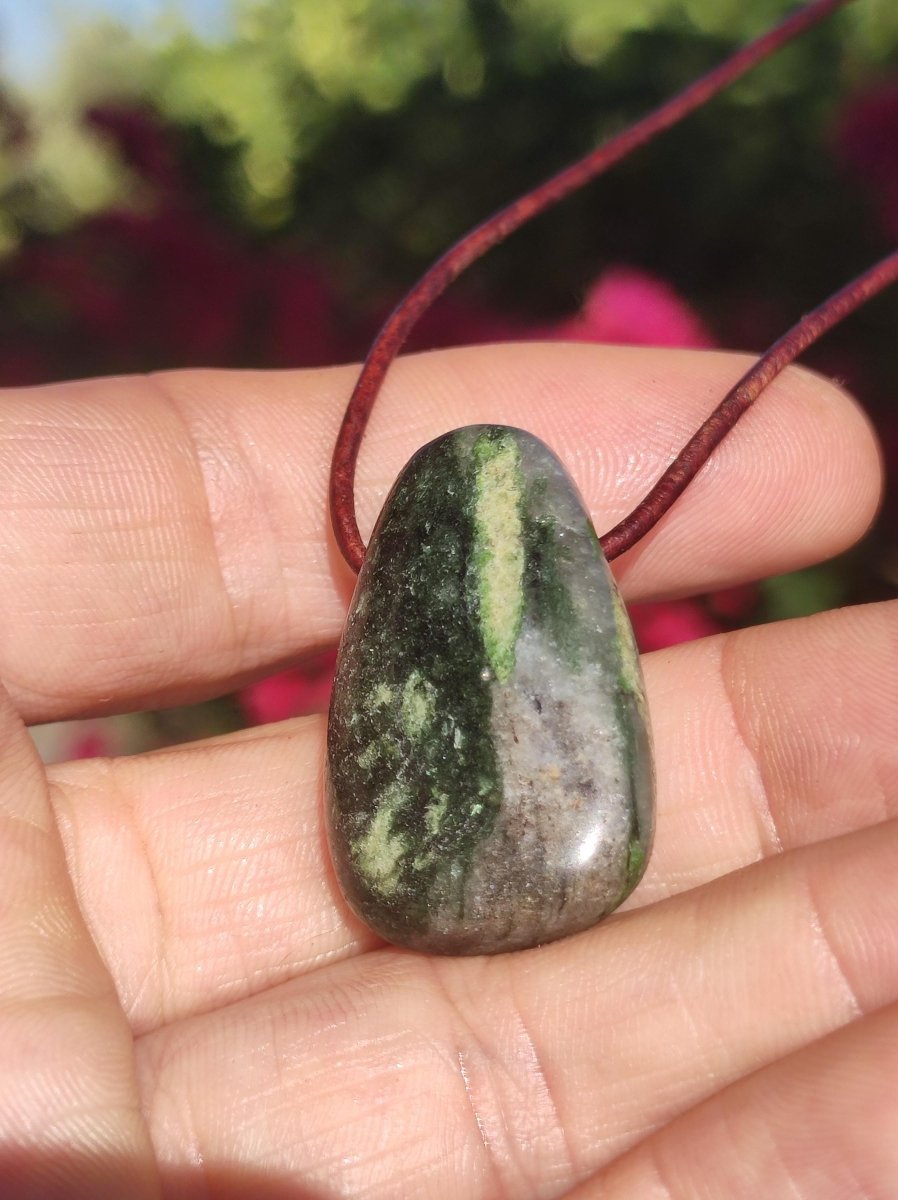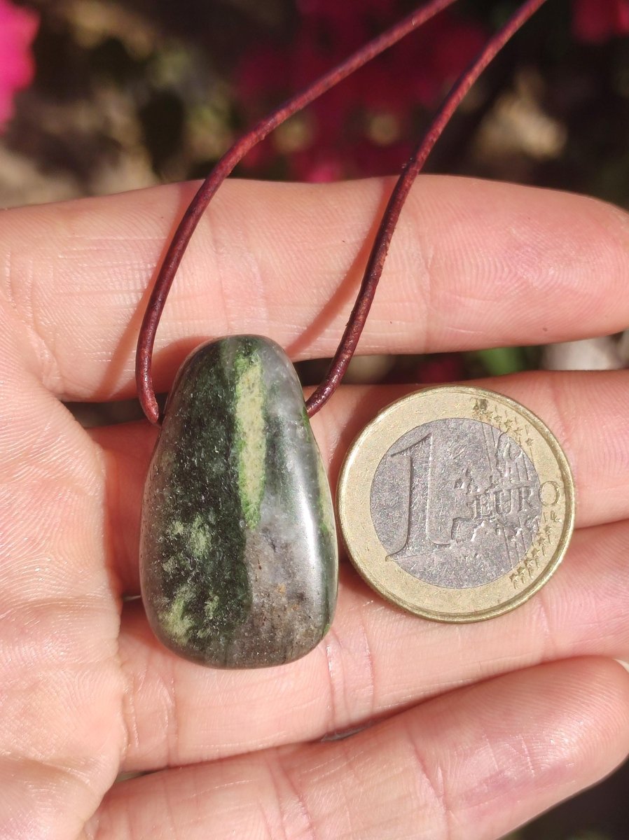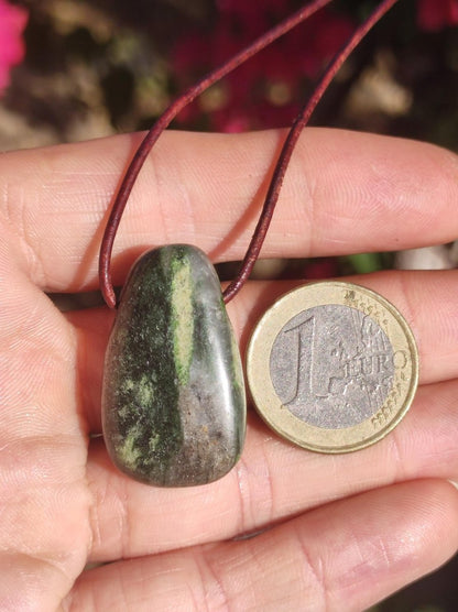 Collier Eelstein avec un diopside rare, non mat, mais très brillant, rarement disponible sous cette forme. Avec cordon en cuir marron antique de 2 mm à nouer. Le nom diopside...