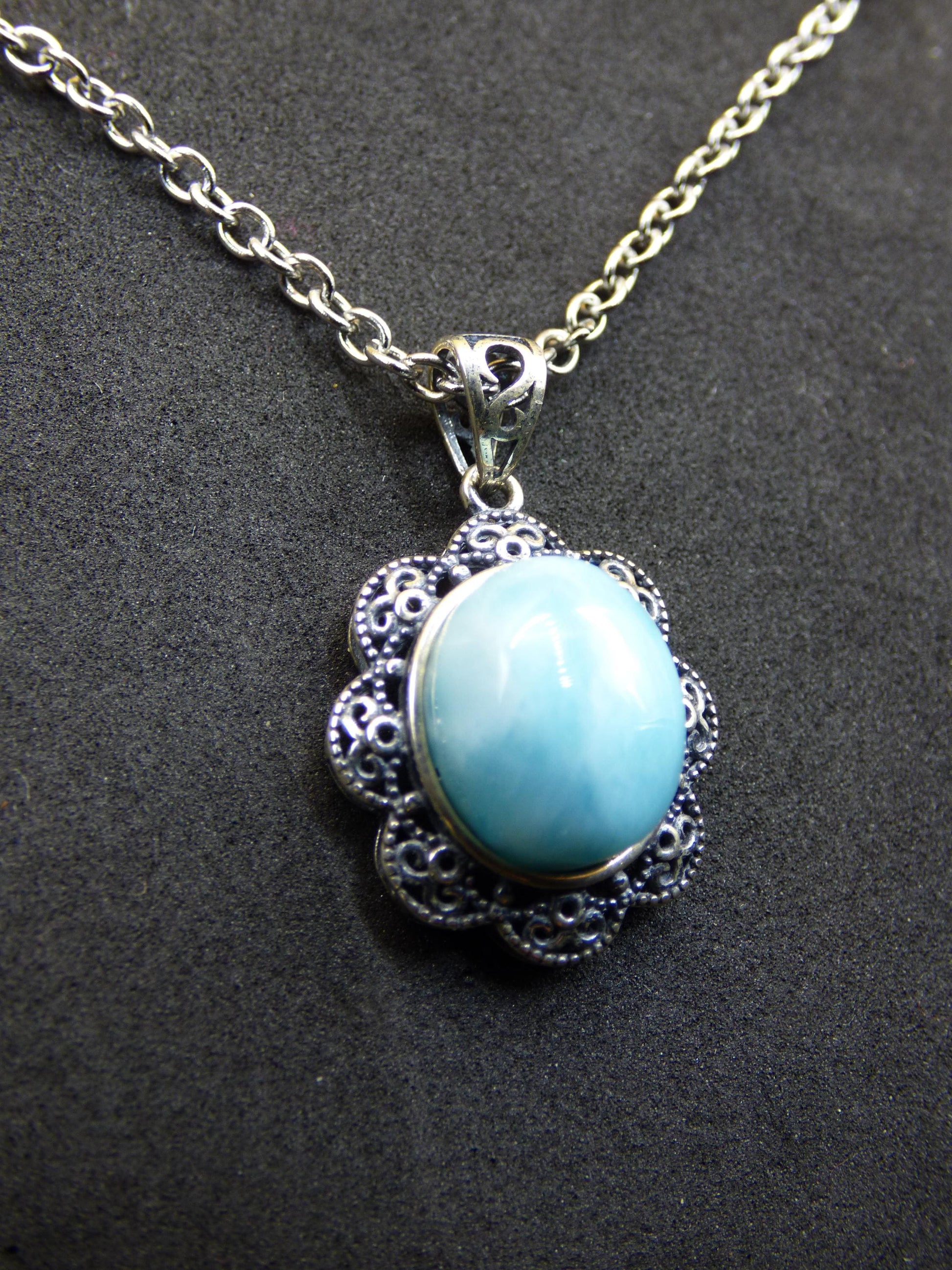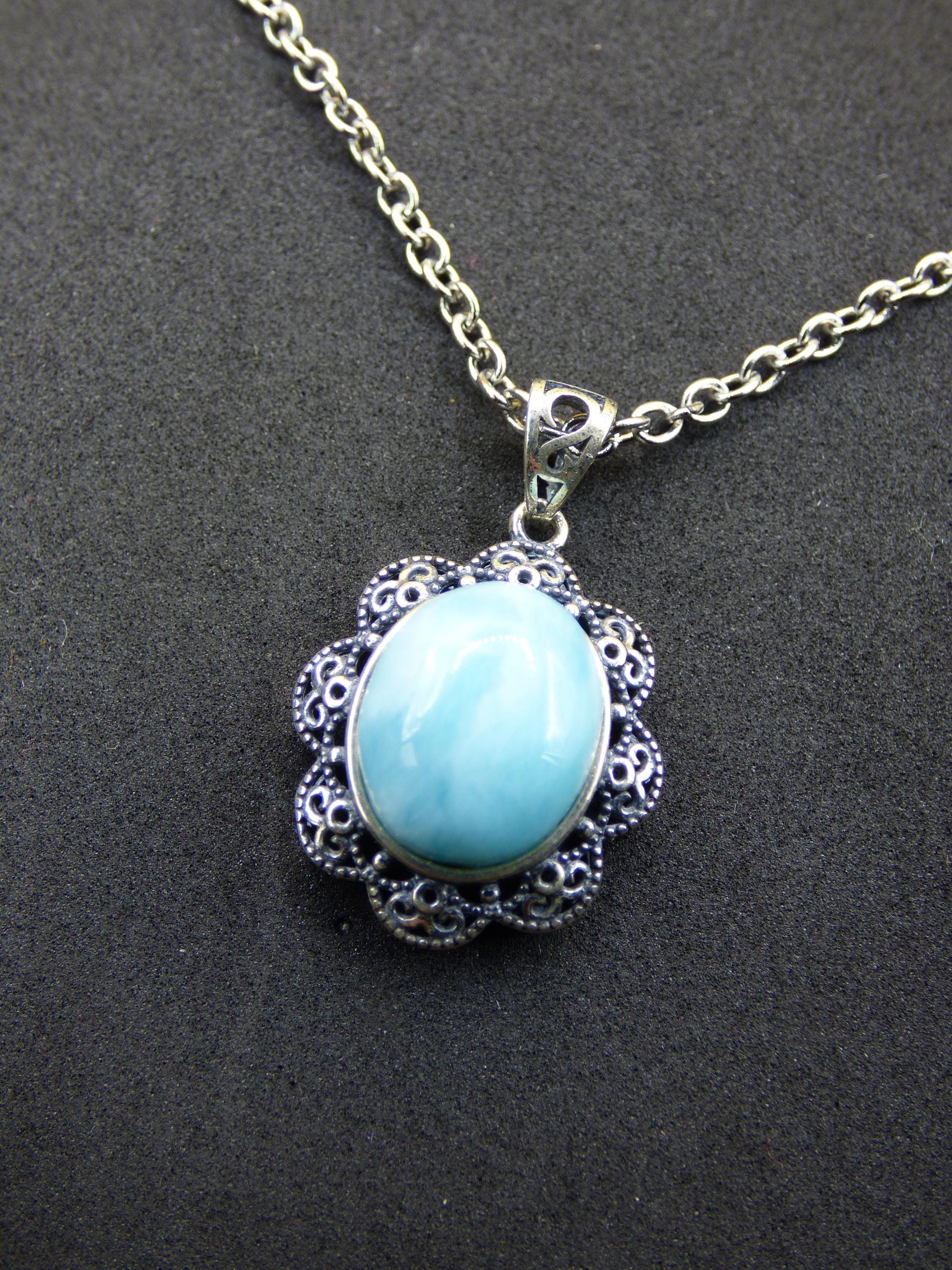 Magnifique collier de pierres précieuses finement travaillées, avec une pierre de Larimar de qualité A entièrement sertie dans un cadre en argent sterling 925 (décoré) + œillet - comprenant une chaîne en acier inoxydable 304 avec fermoir mousqueton.