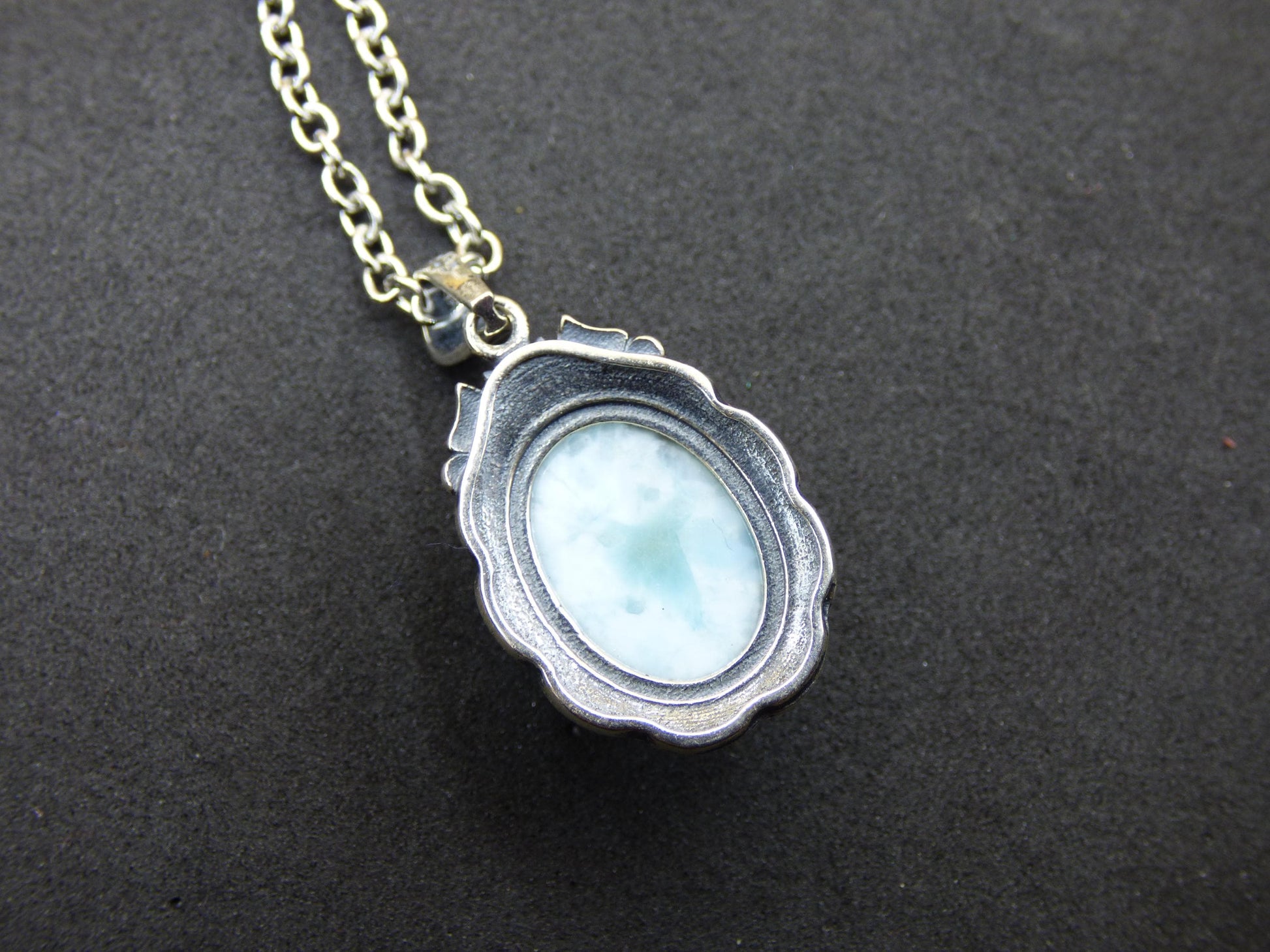 Magnifique collier de pierres précieuses finement travaillées, avec une pierre de Larimar de qualité A entièrement sertie dans un cadre en argent sterling 925 (décoré) + œillet - comprenant une chaîne en acier inoxydable 304 avec fermoir mousqueton.
