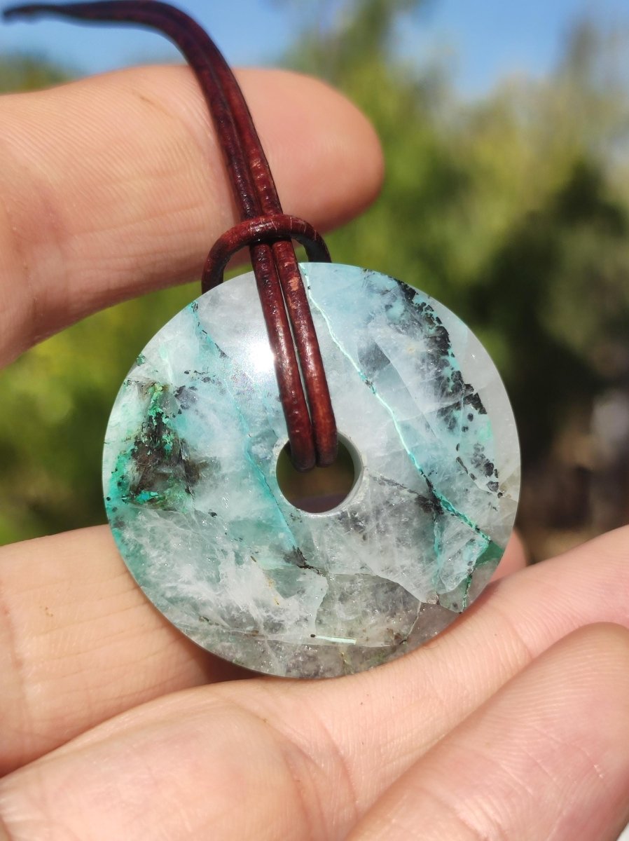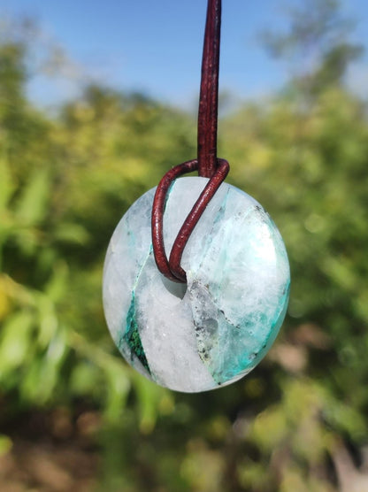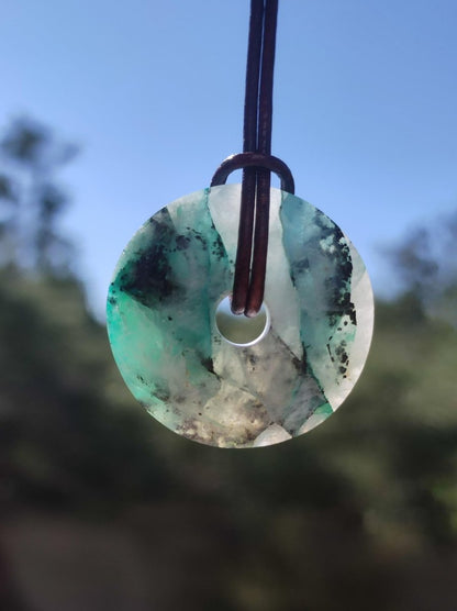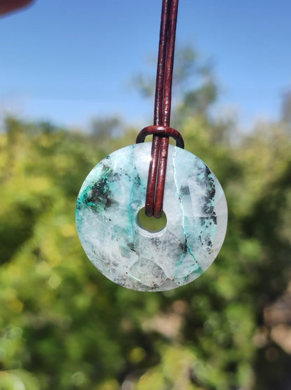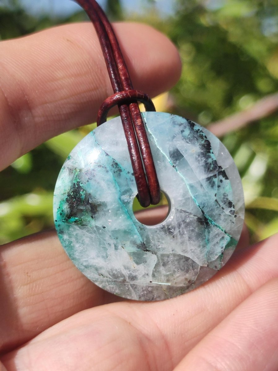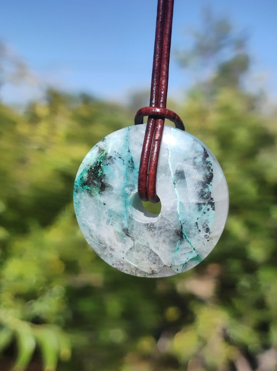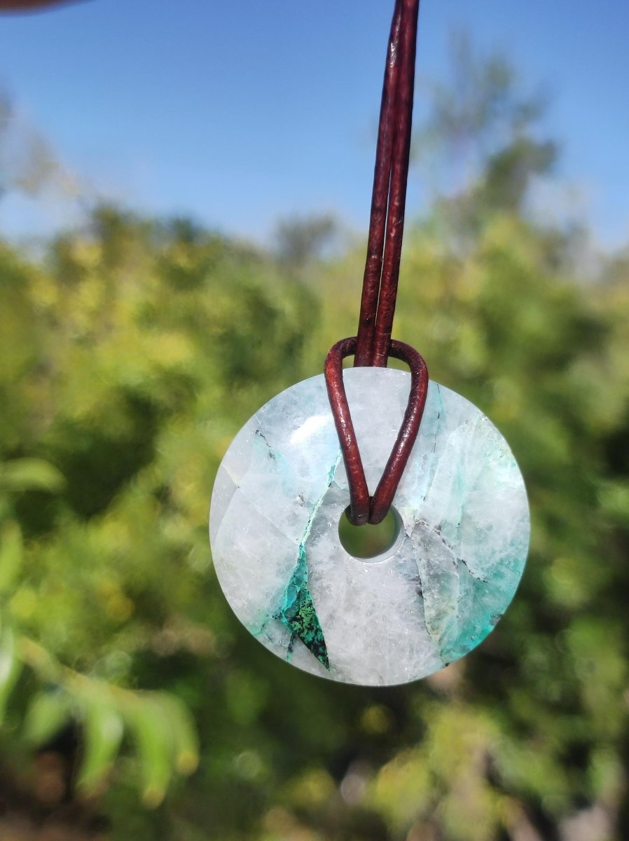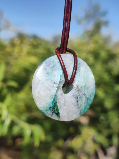 Collier de pierres précieuses Quantum Quattro Donut de 30 mm ~ comprenant un cordon en cuir de 1,5 mm en brun antique à nouer à la longueur souhaitée.