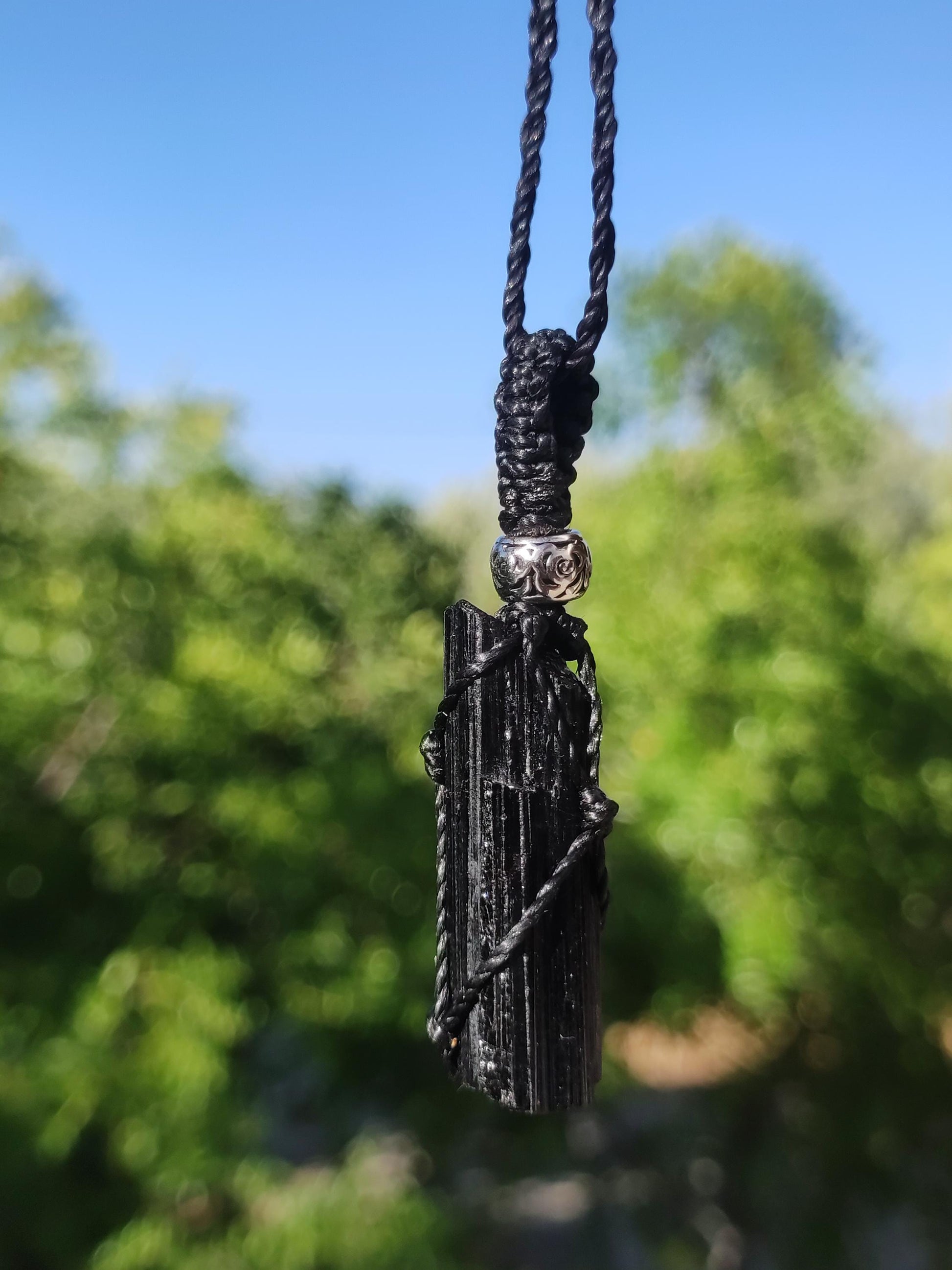 Collier en tourmaline noire brute AAA ~ Collier en macramé ~ décoré d'une perle en acier inoxydable tibétain 304 de haute qualité Matière : Fil macramé ciré du Brésil -...
