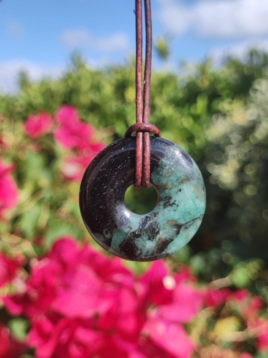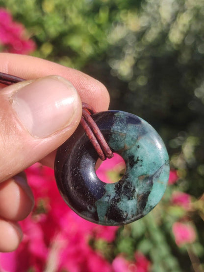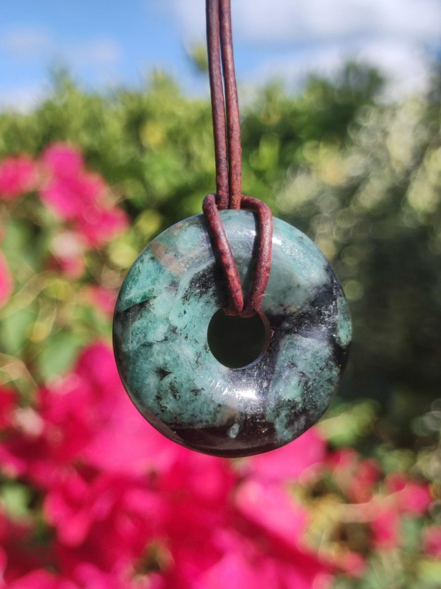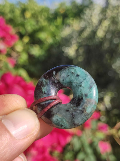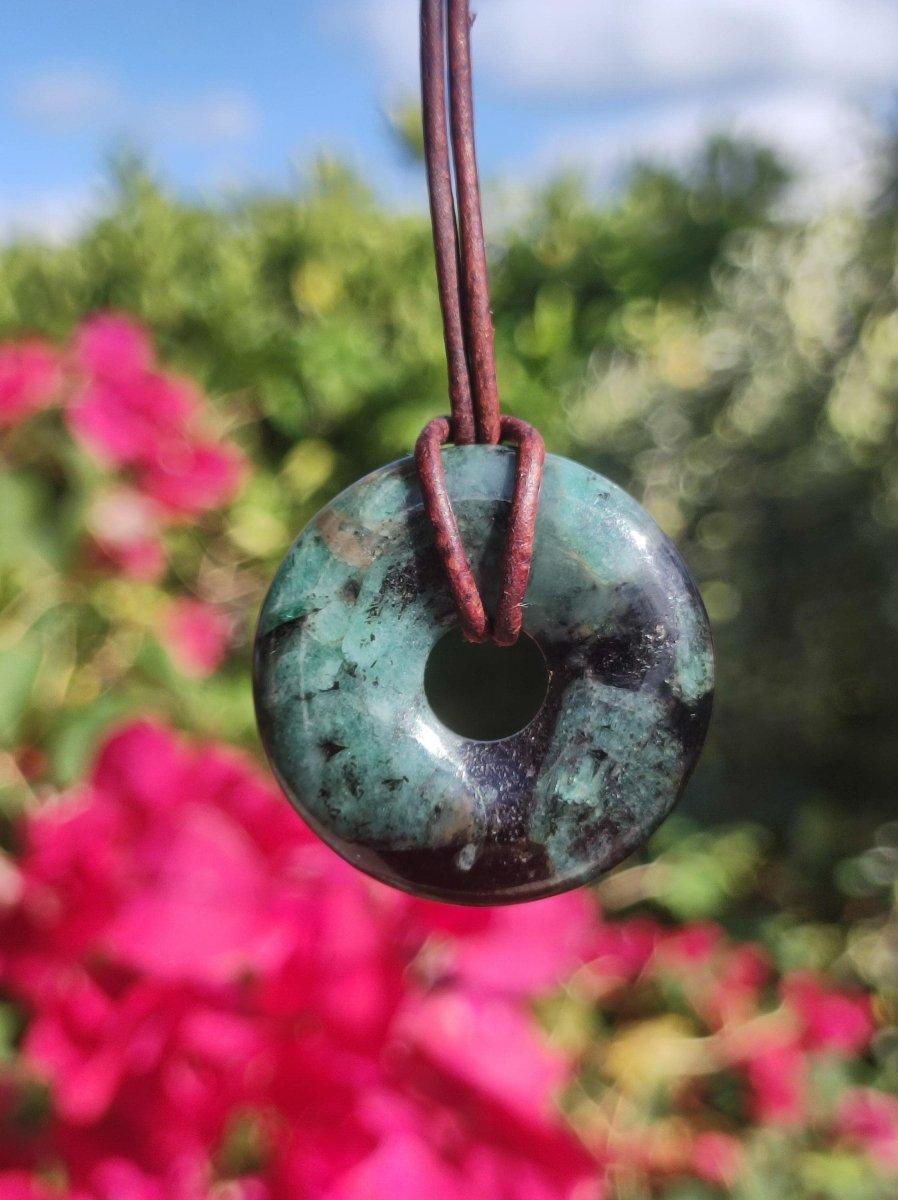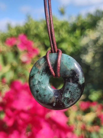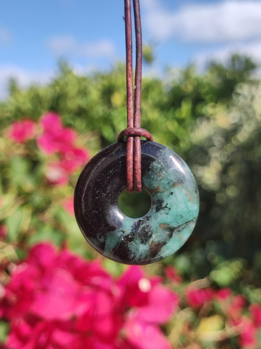 Donut émeraude ~ Collier de pierres précieuses comprenant un cordon en cuir brun antique de 1,5 mm