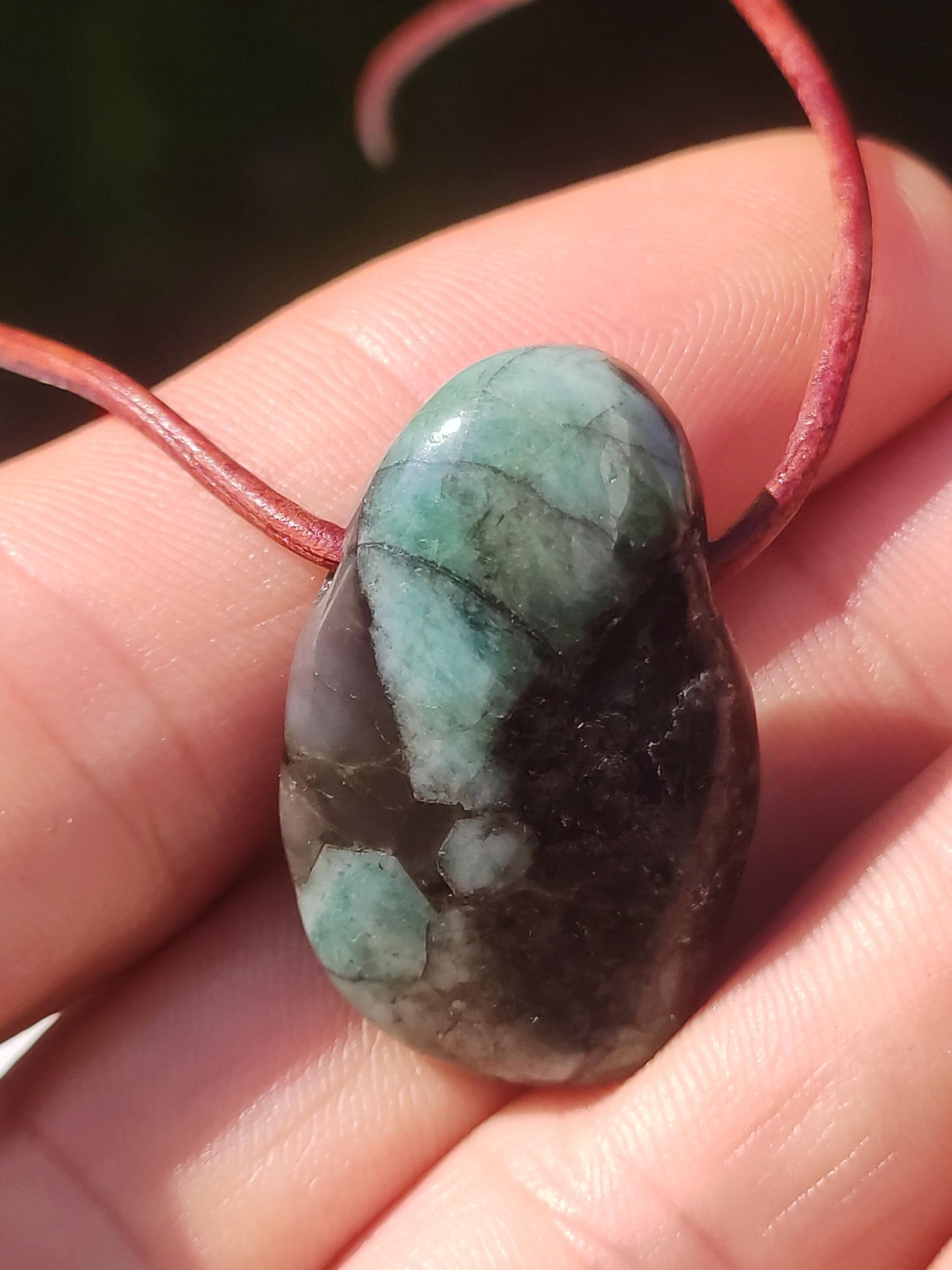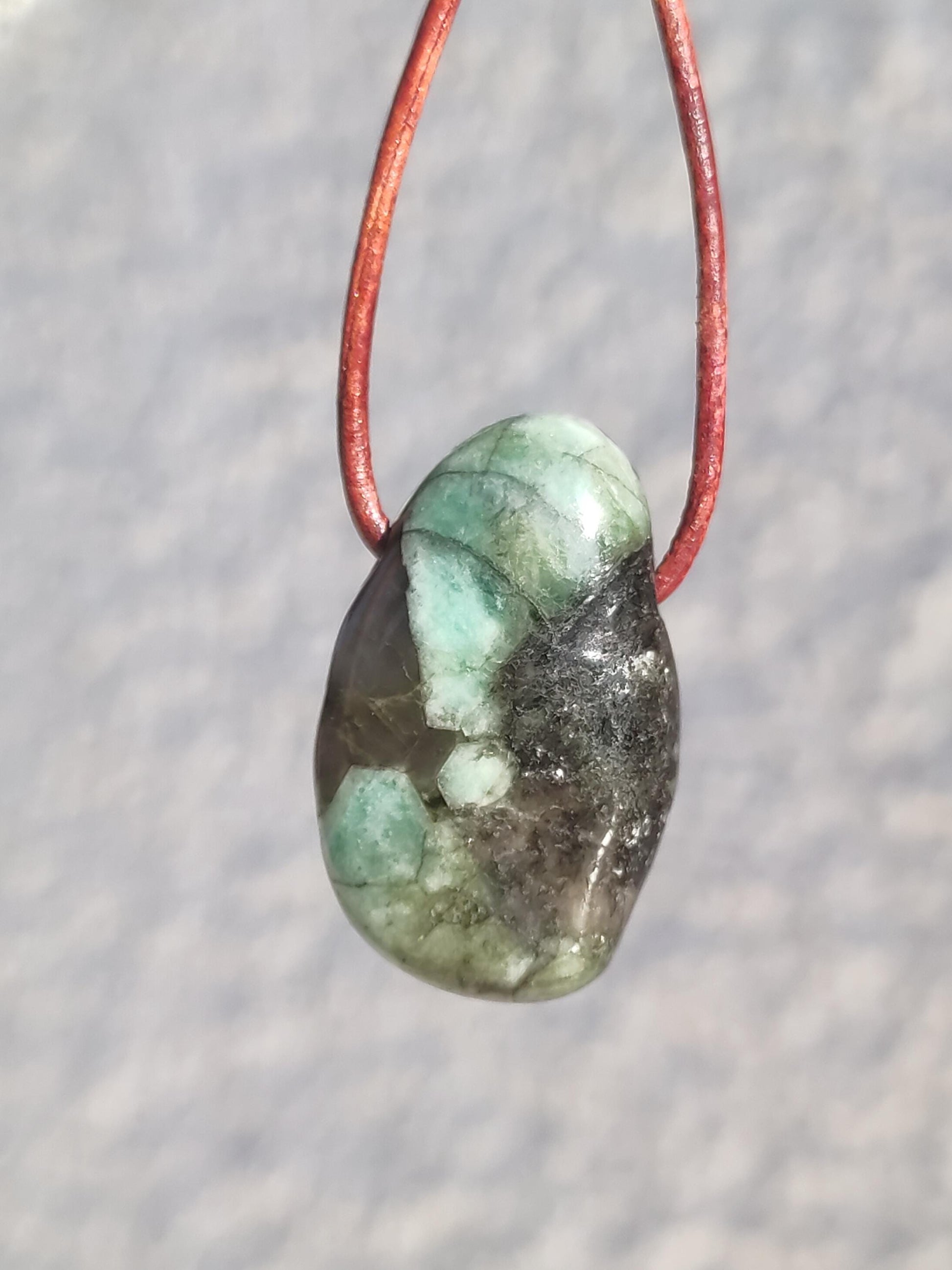 Collier en émeraude ~ avec cordon en cuir marron antique de 2 mm