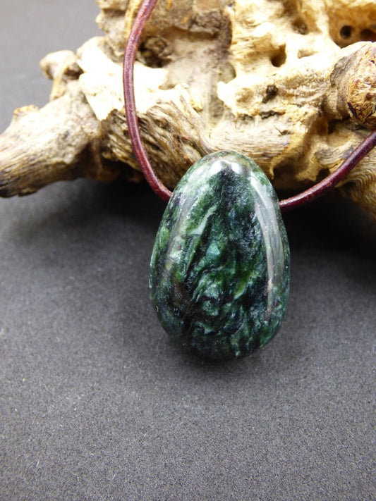 Collier en séraphinite ~ Pierre précieuse de qualité supérieure. Comprend une lanière en cuir marron antique de 2 mm pour ajuster la longueur. La clinochlore est un silicate de magnésium,...