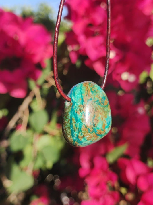 Magnifique collier de pierres précieuses Chrysocoll ~ comprenant un cordon en cuir de 2 mm en brun antique à nouer. Origine : Pérou (Sur le bord, cette pierre présente un...
