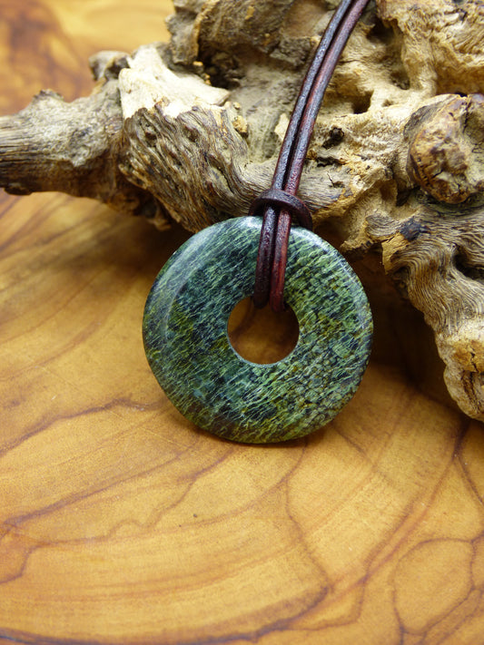 Collier de pierres précieuses avec une serpentine naturelle ~ œil argenté ~ beignet de 25 mm avec cordon en cuir de 2 mm en marron antique à nouer. Vous recevrez...