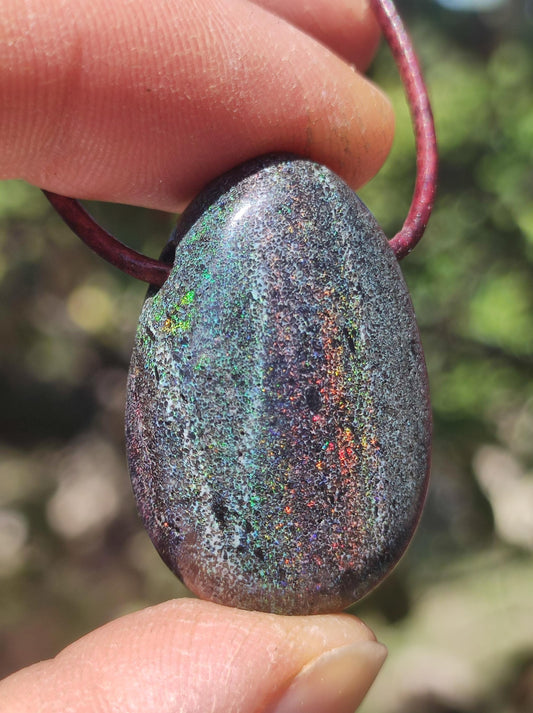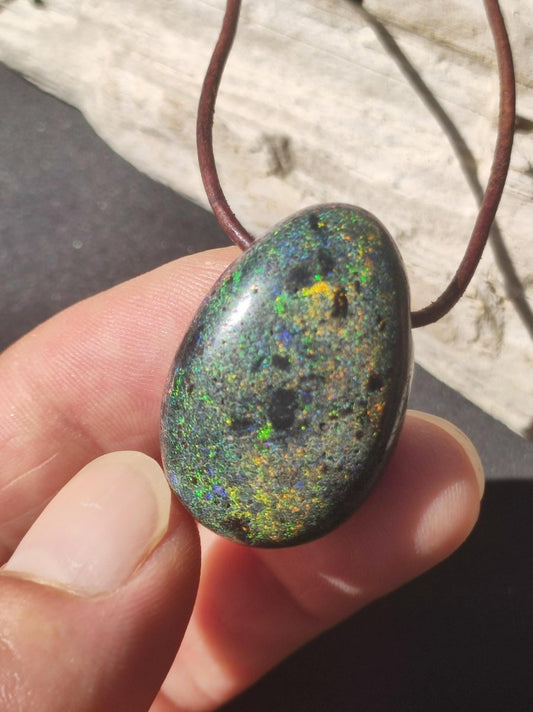 ~Black Opal~ avec bracelet en cuir de 2 mm en marron antique *Aucune photo ne peut capturer la beauté et l'éclat coloré, alors regardez la vidéo Taille: 31 x 21...