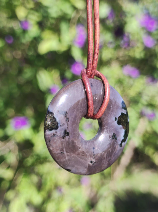 Collier en pierre précieuse avec un donut de 30 mm en gabbro mystique / merlinite mystique / gabbro indigo - comprenant un cordon en cuir marron antique de 2 mm...