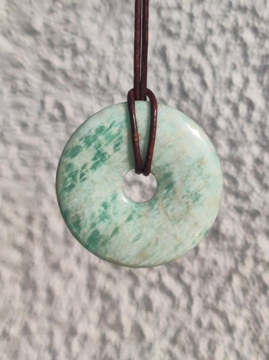 Collier de pierres précieuses avec un beignet d'amazonite (40 mm) ~ avec cordon en cuir de 2 mm marron antique à nouer. Lorsque l’on commence à s’intéresser au sujet des...