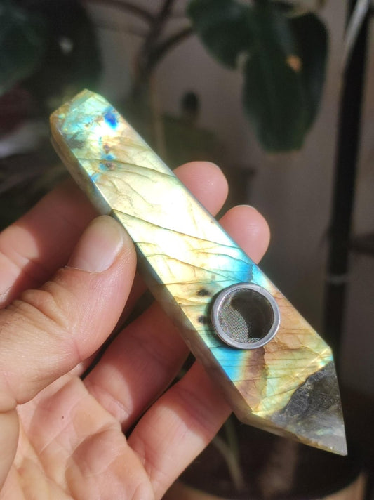 Une pipe incroyable qui ne devrait pas manquer dans votre inventaire de festival ;-) ~Tuyau en pierre précieuse labradorite qualité AAA + tamis de haute qualité amovible~ Poids environ 90g...