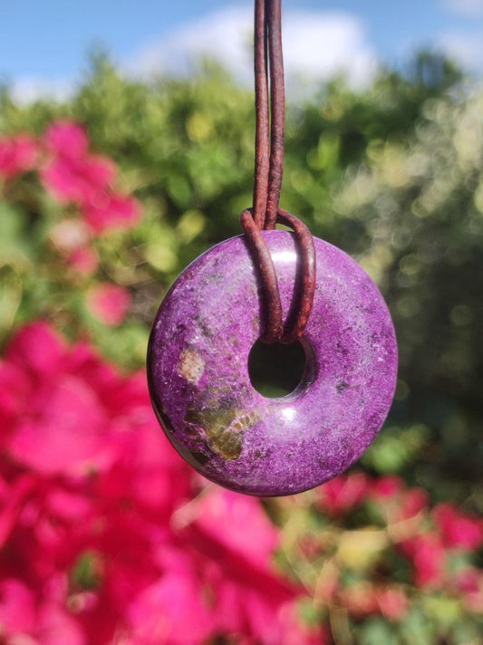 Collier en pierres précieuses ~ Donut Stichtite 30 mm ~ avec cordon en cuir marron antique de 1,5 mm pour le nouage. La partie verte est serpentine Vous recevrez le...