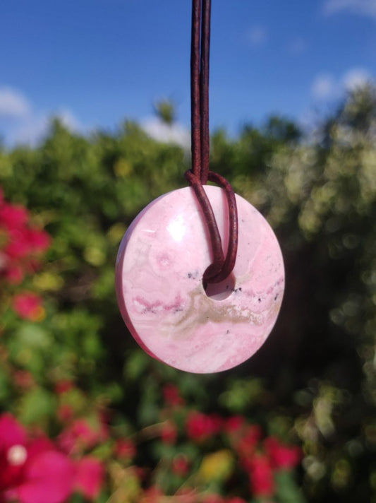 Rhodonite Donut - Collier de pierres précieuses ~ forme de beignet de 30 mm ~ comprenant un cordon en cuir de 1,5 mm en brun antique pour le nouage. Origine...