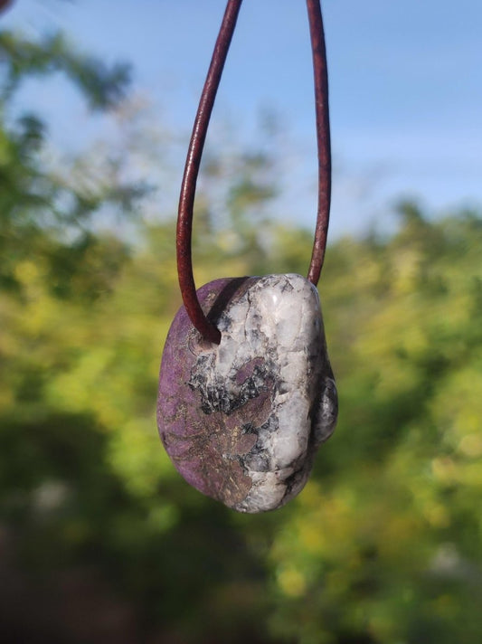 Une trouvaille très rare ~ Purpurite Comprend une lanière en cuir marron antique de 2 mm à nouer à la longueur souhaitée. Les pierres précieuses et les cristaux produisent des...
