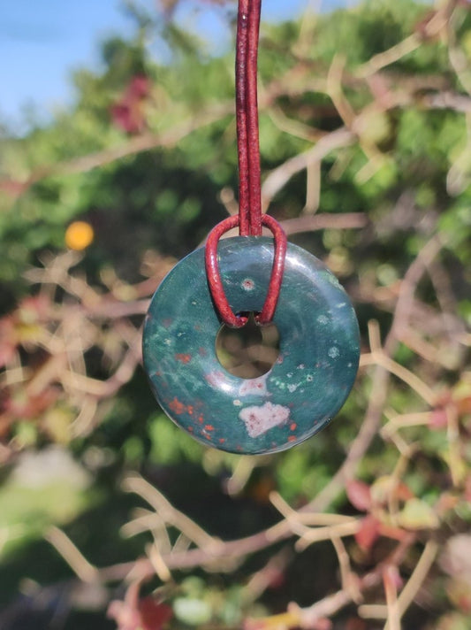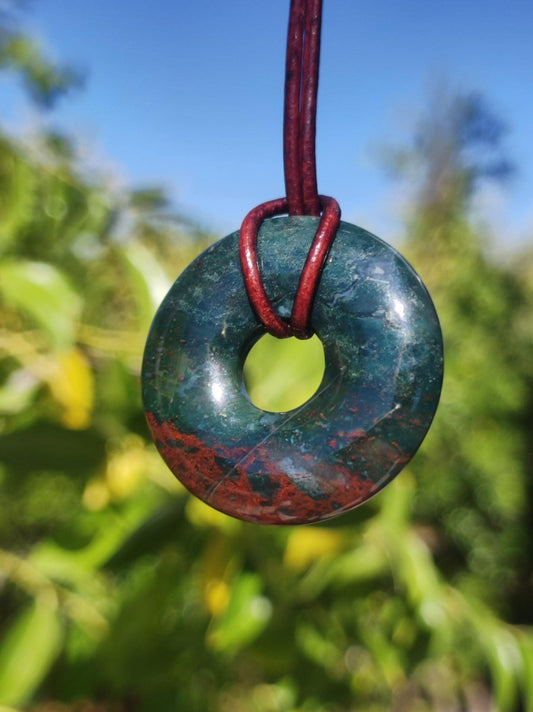 Héliotrope ~ Donut 30 mm ~ Collier en pierre précieuse ~ avec cordon en cuir marron antique de 2 mm pour nouer héliotrope En lithothérapie (guérison par les cristaux) selon...