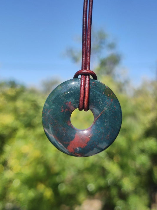 Héliotrope ~ Donut 30mm ~ Collier de pierres précieuses ~ comprenant un cordon en cuir de 2 mm en brun antique pour le nouage héliotrope Dans la lithothérapie selon Hildegard...