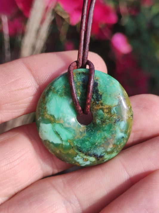Collier en pierre précieuse avec une variscite de 30 mm en forme de beignet, d'un vert intense et très rare, comprenant un cordon en cuir marron antique de 2 mm...