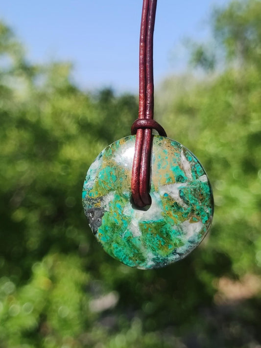 Collier en cuprite-chrysocolle de 40 mm en forme de donut - Cordon en cuir marron antique foncé de 2 mm inclus pour les nœuds. La chrysocolle est un minéral dont...