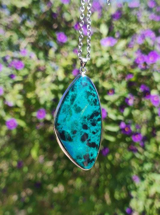 Collier Chrysocoll AAA ~ avec monture en argent sterling 925 + œillet et chaîne en acier inoxydable 304 avec fermoir mousqueton Origine : -Pérou Poli : -Pérou, dans notre production...