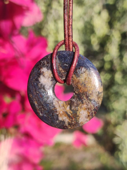 Collier de pierres précieuses en forme de donut Pietersite avec cordon en cuir de 1,5 mm en marron antique Taille du beignet : 30 x 6 mm Pietersite La pietersite...