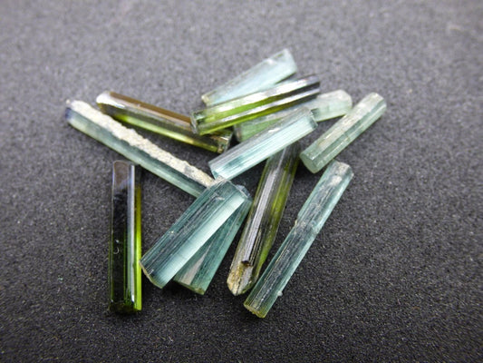 SET 12x stylos bruts tourmaline verte qualité A Vous recevez toutes les pierres illustrées Poids : 11,5 ct (2,3 g) Origine : Brésil Taille : 10-18 mm (+voir comparaison des pièces...