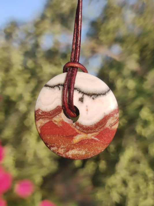 Red River Sunset ~ Gemstone Donut Necklace ~ comprenant un cordon en cuir de 1,5 mm en brun antique à nouer pour la longueur souhaitée Vous recevrez le beignet illustré...