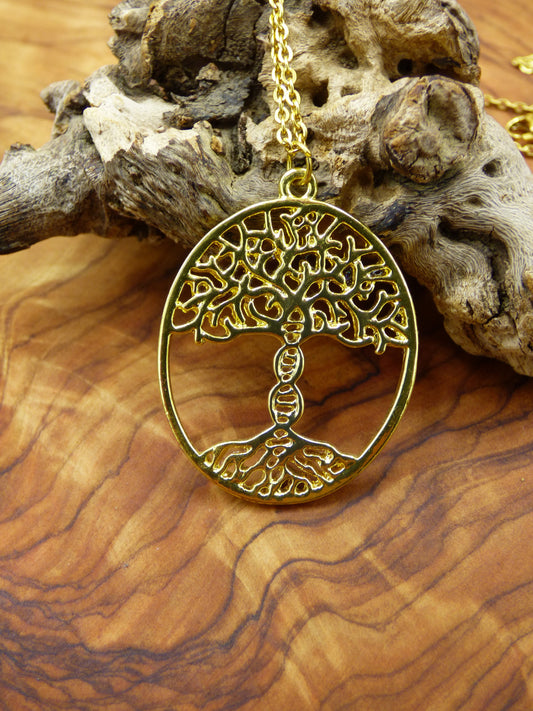 Chaîne pendentif Tree DNA en métal et alliage de zinc doré. Avec chaîne à maillons avec mousqueton (si désiré, y compris bracelet en cuir de 1,5 mm en marron antique)...