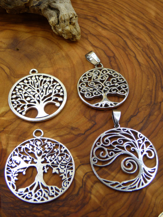Chaînes à pendentif arbre (rotatives - double face) 4 motifs différents : Les motifs 1+3 sont en métal avec un alliage de zinc argenté Les motifs 2+4 sont en acier...
